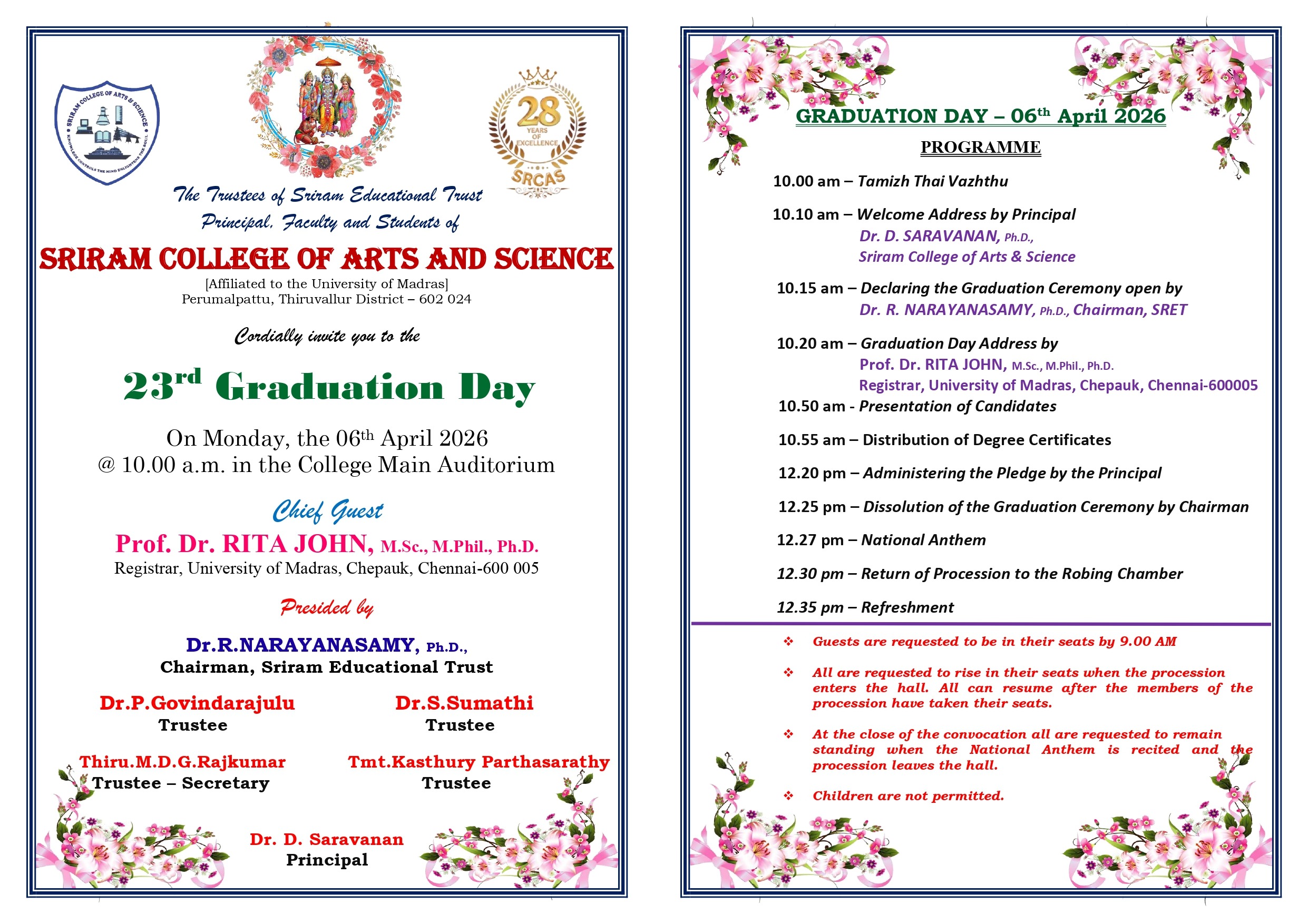 Sriram College of Arts and Science was instituted in the year 1998. It is affiliated to the University of Madras and approved by the AICTE and the Government of Tamilnadu. It is situated at Perumalpattu near Veppampattu Railway Station. This esteemed institution has been successfully servicing the society for the past 27 years and its dedicated service continues with current developments enriching the students and guiding the youngsters to pursue knowledge and higher education. The college has produced several University Rank Holders. Keeping up with this well-established tradition, the college is providing excellent placement consistently.
